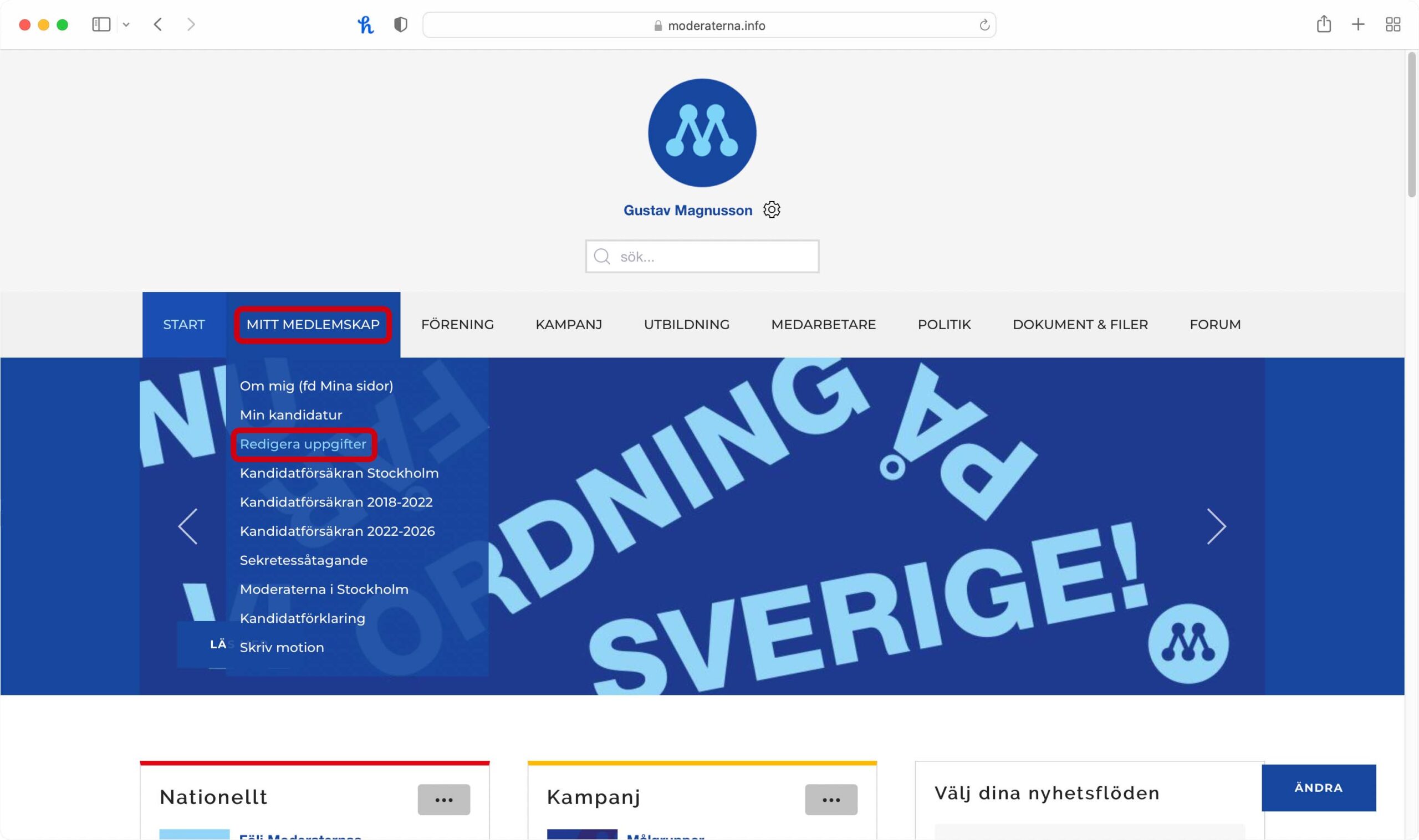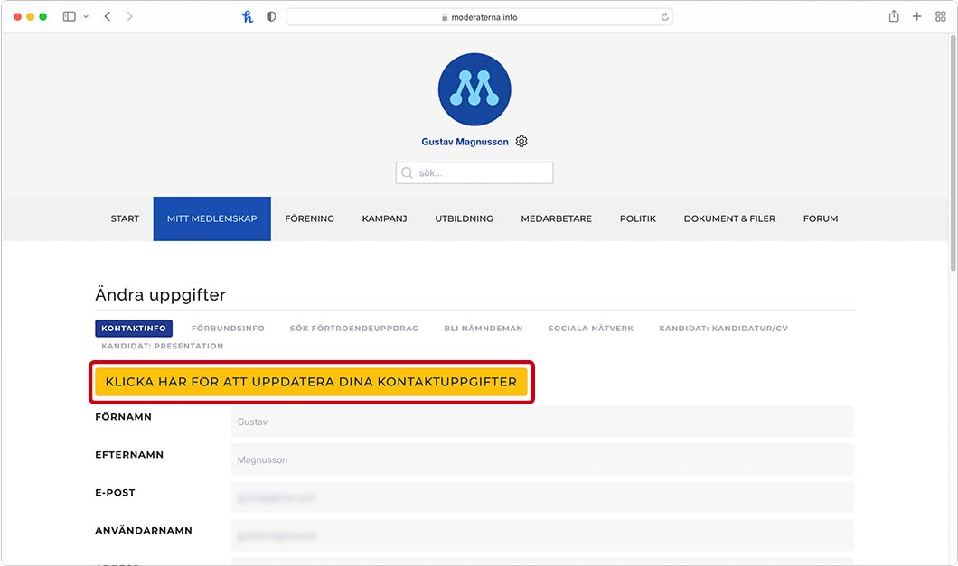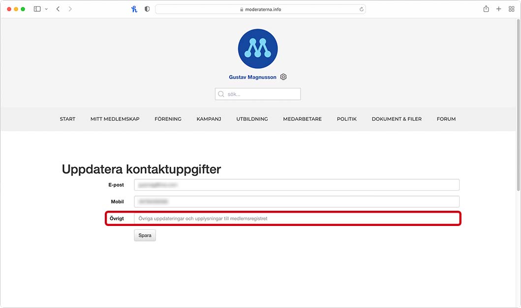 På intranätet kan du hantera ditt medlemskap (se bilder). Där kan du uppdatera e-postadress och mobilnummer. I fältet ”Övrigt” kan du bland annat ange om du önskar byta förening eller avsluta ditt medlemskap. Ange ”MUF” och därefter din begäran. Inloggning till intranätet sker i första hand med Mobilt bank-ID. Om du saknar Mobilt Bank-ID eller har problem med inloggningen vänligen mejla muf.medlem@moderaterna.se.